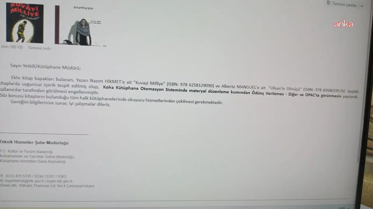 Cumhuriyet Halk Partisi (CHP) İstanbul Milletvekili Gamze Akkuş İlgezdi, Kültür ve Turizm Bakanlığı’na bağlı halk kütüphanelerinde, Nazım Hikmet’in “Kuvayi Milliye Destanı” şiirini anlatan Nuri Kurtcebe’ye ait bir çizgi roman versiyonunun ve Alberto Manguel’in “Ulises’in Dönüşü” kitaplarının “uygunsuz içerik” gerekçesiyle yasaklandığını belirterek, konuya ilişkin soru önergesi verdi.